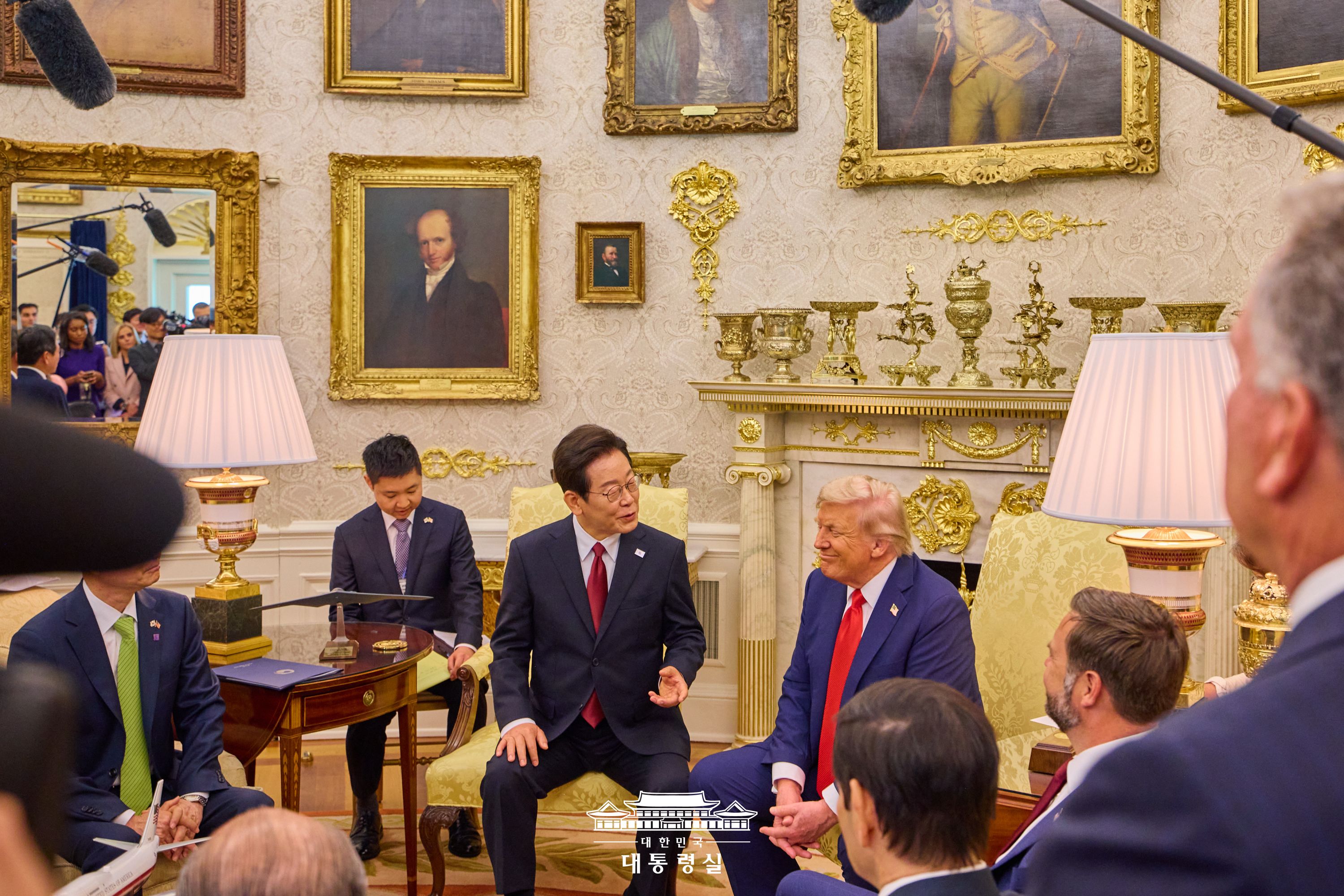 트럼프 대통령은 이재명 대통령에게 현재 한국의 정치적 상황에 대해 묻고, 교역 및 관세 협상에 대한 간단한 점검을 했습니다. 이어 두 정상은 미국 조선업의 현재와 미래에 대해 이야기했습니다.